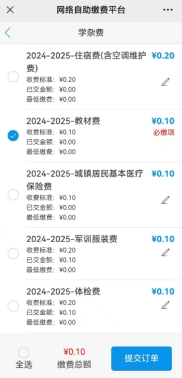 第三步:在“网络自助缴费平台”输入姓名+学号/身份证号+验证码,点击“缴费/查询”登录。登录平台后选择缴费类别“学杂费”,确认缴费金额无误后点击“提交订单”并完成支付。