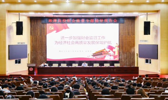 为进一步推动湘潭高校广大财务人员深入学习宣传贯彻中共中央办公厅、国务院办公厅《关于进一步加强财会监督工作的意见》(以下简称《意见》)和湖南省委办公厅、省政府办公厅《关于进一步加强财会监督工作的实施方案》(以下简称《实施方案》),6月9日下午,湘潭高校财会监督专题辅导报告会在我校一报告厅举行。报告会由党委副书记、校长易兵主持,湖南省财政厅财政监督局局长、一级调研员张贻旺作辅导报告。湘潭大学、湖南科技大学、湖南工业大学等高校财务人员,以及我校审计人员、校直各单位相关负责人和会计学专业学生代表300余人参加了报告会。
